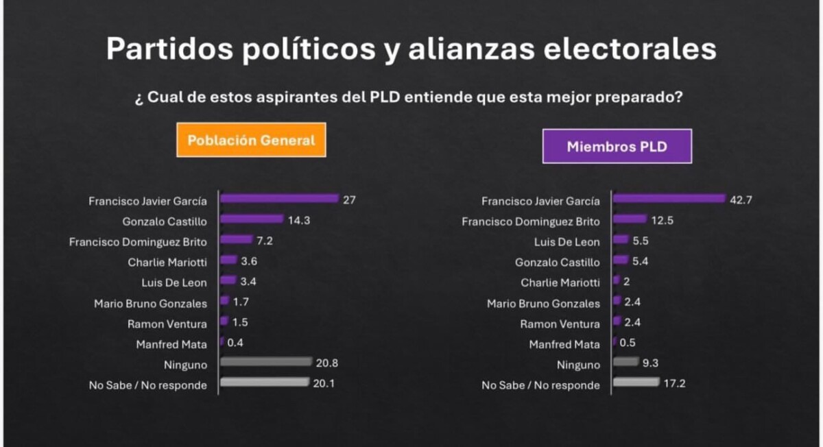 A la pregunta sobre cuál de los aspirantes del PLD está mejor preparado, entre los miembros del partido morado, el 42.7 % favoreció a Francisco Javier García, seguido de Francisco Domínguez Brito con 12.5 %; Luis de León con 5.5 %; Gonzalo Castillo con 4 %; y Charlie Mariotti con 2 %.