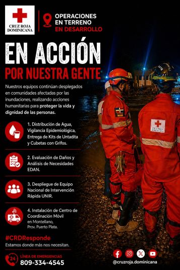Santo Domingo. D.N La Cruz Roja Dominicana (CRD) hizo un llamamiento al sector público, privado y particulares a que la apoyen en los esfuerzos y acciones de respuestas a la situación de crisis y emergencias ocurridas en provincias y comunidades del país afectadas por las últimos fenómenos hidrometereológico que han causado inundaciones sin precedente en provincias como Puerto Plata, Santiago, Espaillat, Valverde, entre otras, afectando a más de un millón de personas, sus medios de vidas, viviendas y sectores productivos, entre ellos microempresarios y pequeños negocios que son el sustento de las familias en estas comunidades.